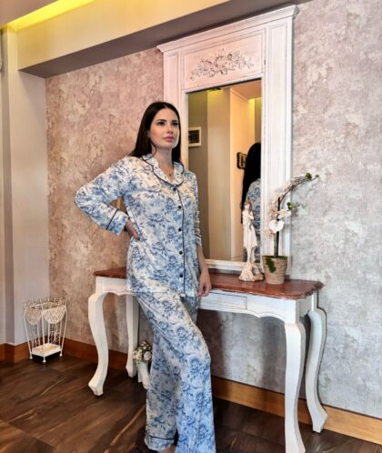 Mavi Rüya Çiçek Esintisi – Önden Düğmeli Pijama Takımı / Likralı Viskon